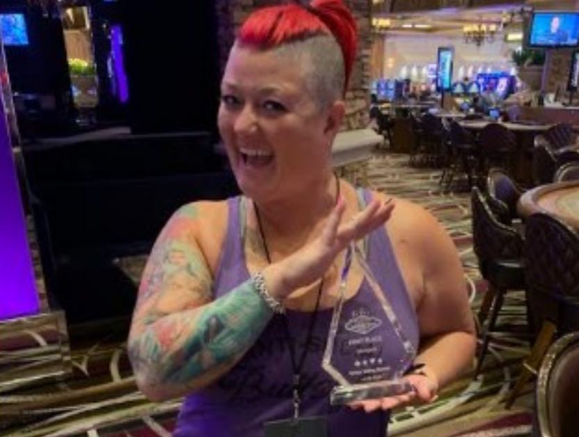 [3] BJ Champion! — Kasie Young is shown in the photo above. Doesn’t she look great! And, guess what? Kasie attended BARGE for the very first time this year, and she won the first tournament she played! Kasie won the BJ Tournament. See Kasie posing proudly with her BJ trophy.* Kasie is the wife of my dear friend Eric Schneller, who also attended BARGE for the first time this year. Eric also cashed in his first tournament. Hey, who the hell invited these two people?