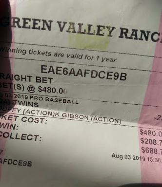 [47] During a break, I have to get down on a baseball game. All my data points say the Minnesota Twins are the lock on the sheet. Fortunately, Bruce Framer isn’t around to pester me, be negative, and talk me out of a winner this time, and I get down the winnings from the previous ticket and roll it into a big worthy favorite. Let it ride!