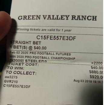 [33] During the early breaks, I rush into the sportsbook to get down our first sports wager of the BARGE trip. First NFL pre-season game. Gotta’ fire! I’ve capped this game until my eyes were blue, and have Denver as a lock to win the game. So, it’s worth $280 of the fund’s money to win back +$200 going off at -140 on the money line. Atlanta, the opponent, has lost 11-straight pre-season games with this head coach. He doesn’t give a Falcon fuck about pre-season, while Denver is breaking in a new staff and offense. Broncos roar to a 7-0 lead and I don’t even look at the TV again until the 4th quarter where I see the shit Broncos have fallen asleep and the Falcons have taken a 10-7 lead. Fortunately, my “LOCK” comes in with a late touchdown, which of course, I totally foresaw in my pregame handicapping. Final score: Denver wins 14-10. Sweet money. This sports wager takes some of the stain of the PLO loss for the day. I’ll take a win any way I can get it. Here’s the winning ticket: