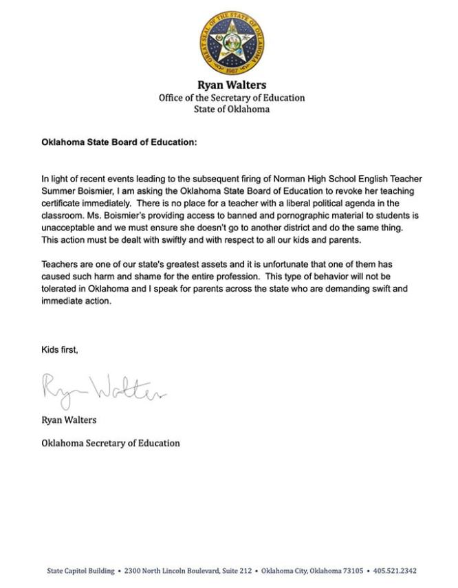 The facts of this case show (please Google “Summer Boismier”) that this is a preposterous reaction by a state-elected official that deserves to be met with ridicule and removed from office. The teacher didn’t give any specific books to her students nor did she assign any controversial books to the class. Fact: She merely provided access to books, and, for that, she is about to be censured by the State of Oklahoma. This amounts to digital book burning and a witch hunt determined to punish anyone who steps outside of the state’s strict far-Right cultural hegemon.