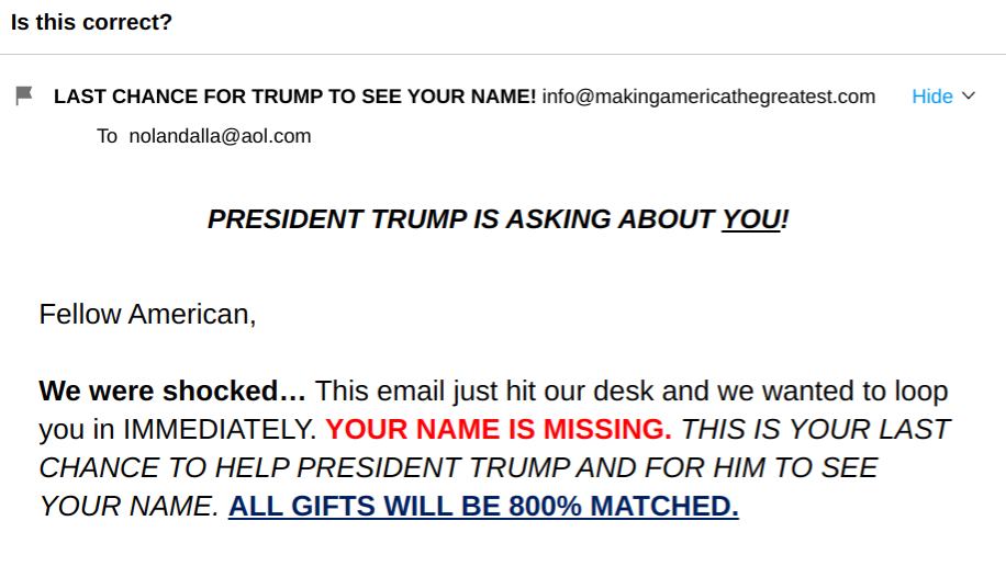 Addendum: Here’s another email from yesterday. “President Trump is asking about me!”